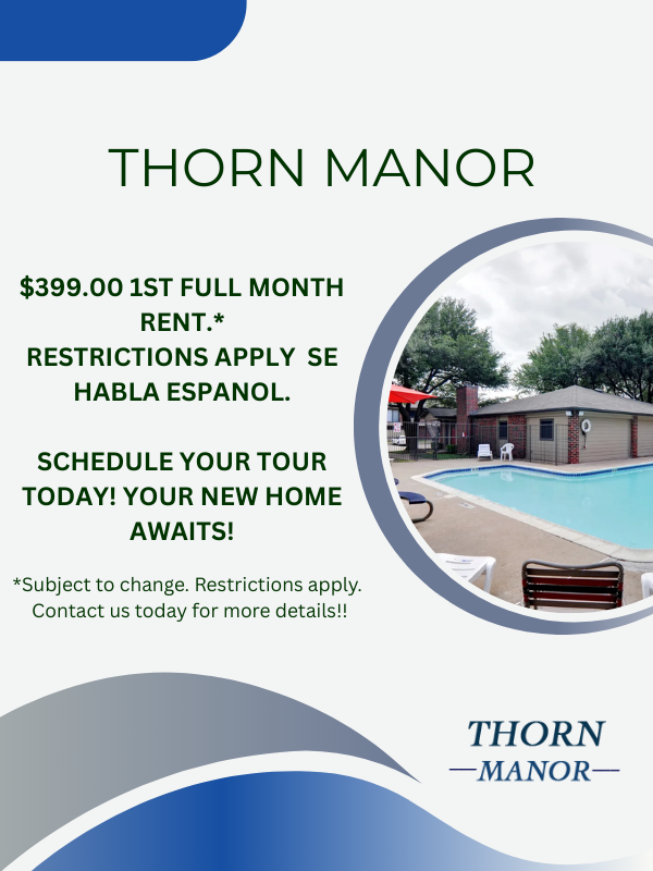 Welcome Home to Thorn Manor Apartments in DeSoto, TX. This community boasts one-, two- and three-bedroom apartment homes with competitive pricing and an incomparable premiere location. Take advantage of the community’s amenities including a sparkling pool, playground, and dog park. Thorn Manor is a spacious community with all the comforts of a home where we offer peaceful living on beautifully landscaped grounds.